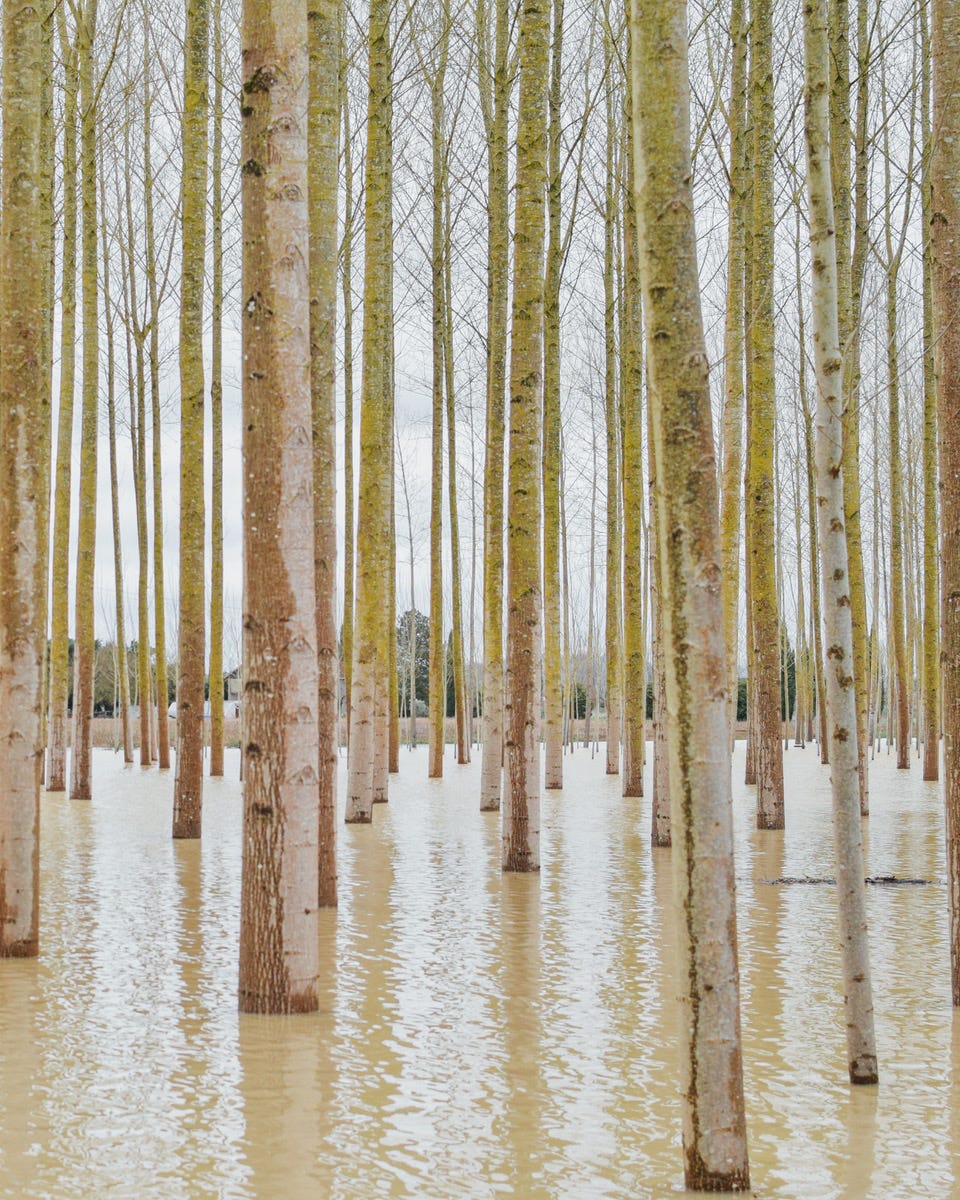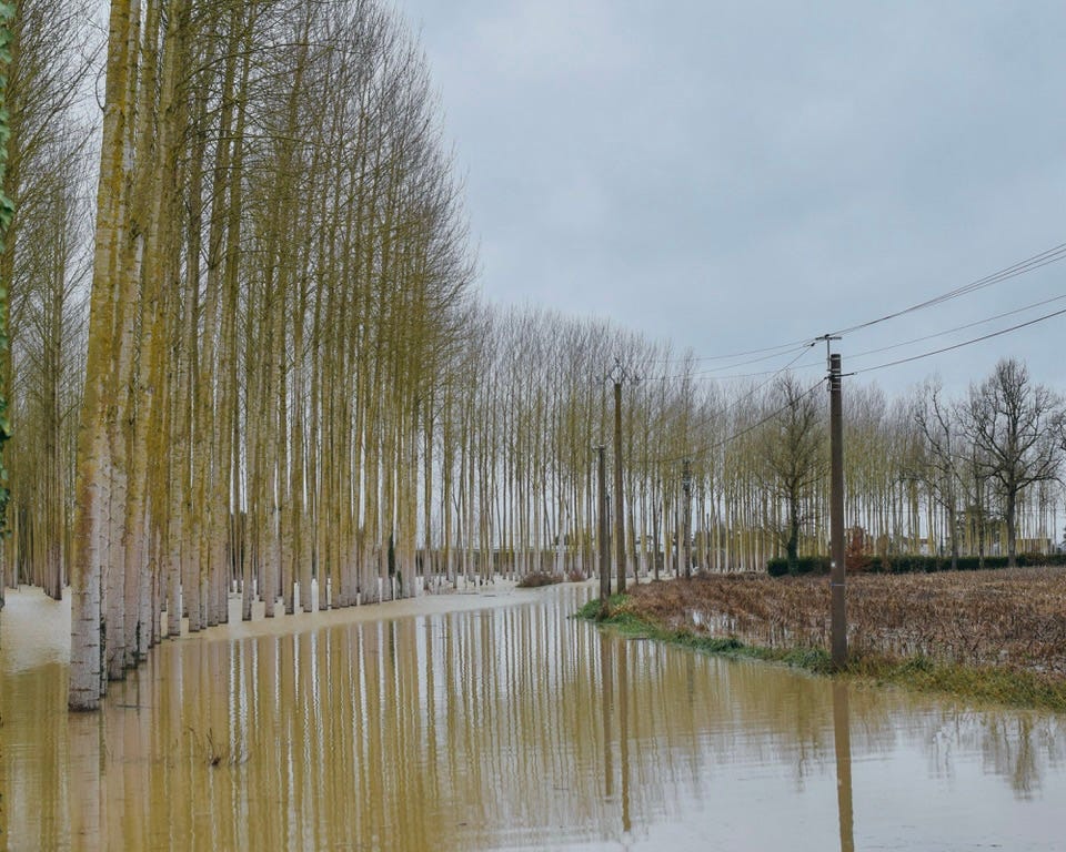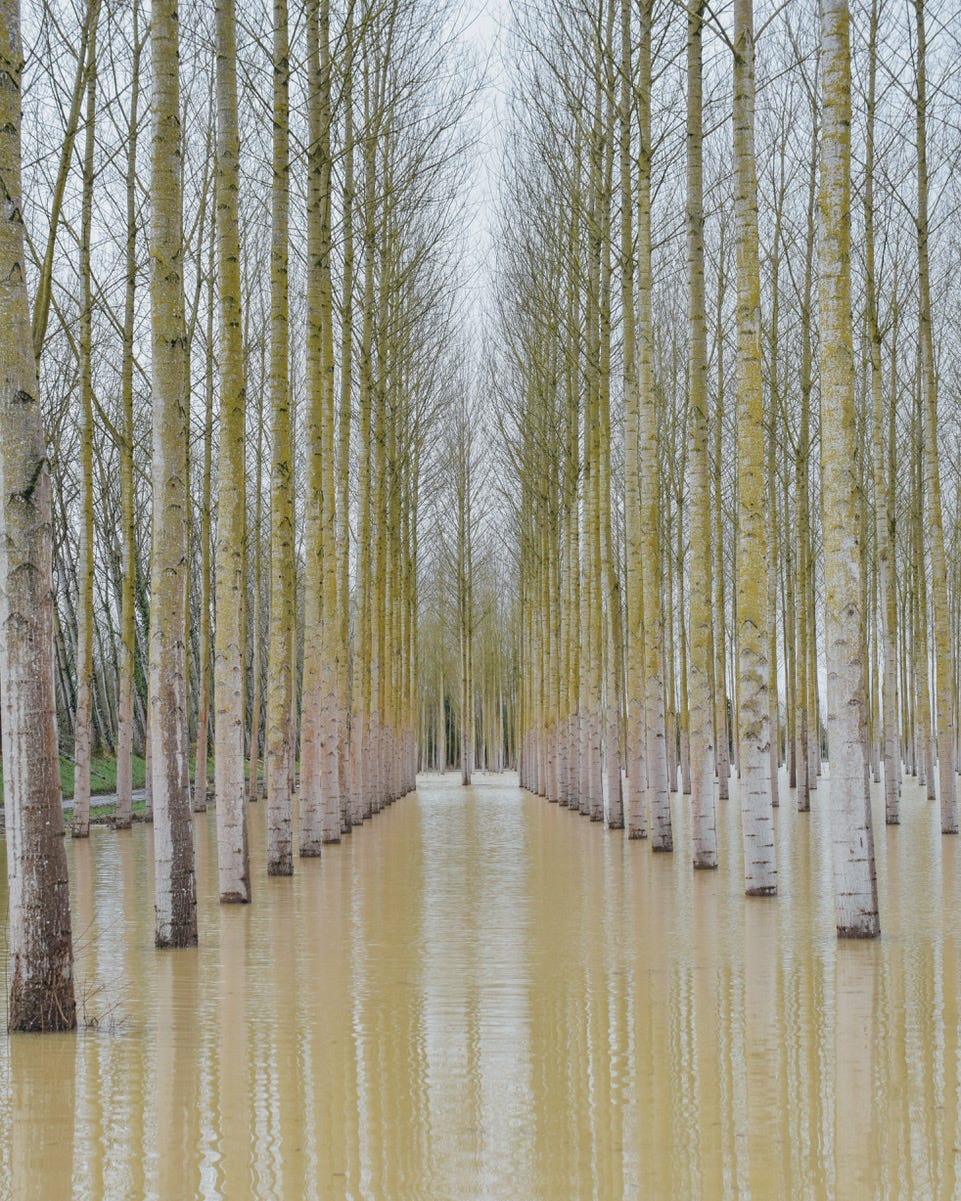 Wednesday brought fallen trees, flooded fields and no electricity for days. With no power for photographing food, I took my camera (and Edie) to see the poplars near Montesquieu. The fields had become lakes, as trees stood in water that shouldn’t be there, creating these scenes of line and light.